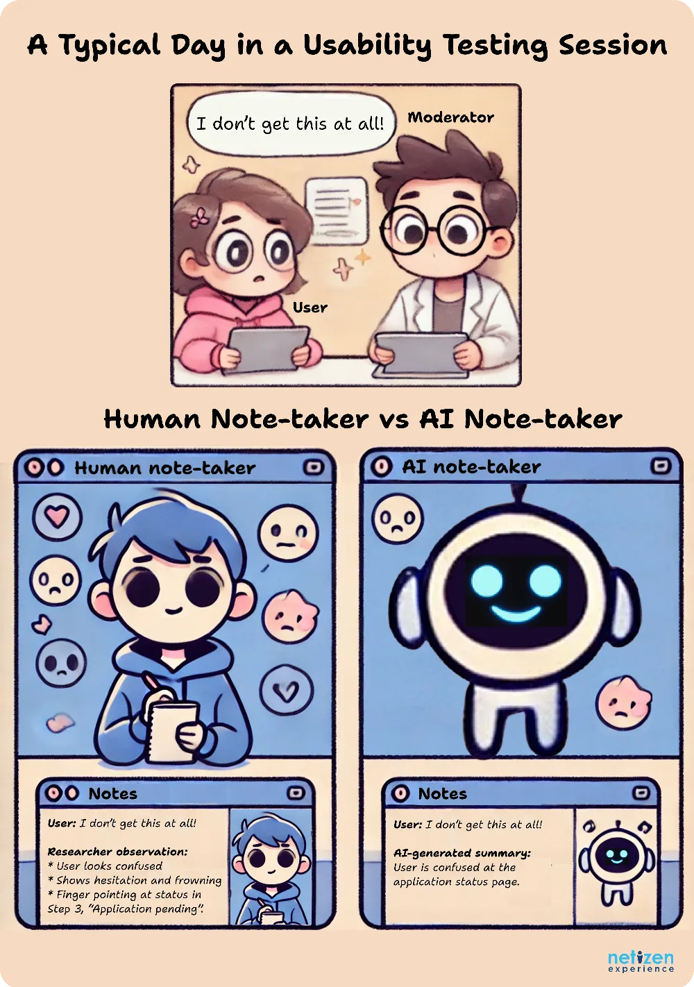 This is where the human touch becomes essential. The key is balancing AI’s efficiency with human insights. The days of note-takers stressing over missed insights could become a thing of the past by letting AI handle the note-taking, while you focus on prioritizing noting down users’ subtle emotional cues that AI might miss. This shift not only ensures that you gather rich and accurate feedback, but also opens up the possibility of reducing manpower. Traditionally, we would have one moderator and one note-taker, but with AI handling the note-taking, one person can effectively manage both roles, leading to greater efficiency.