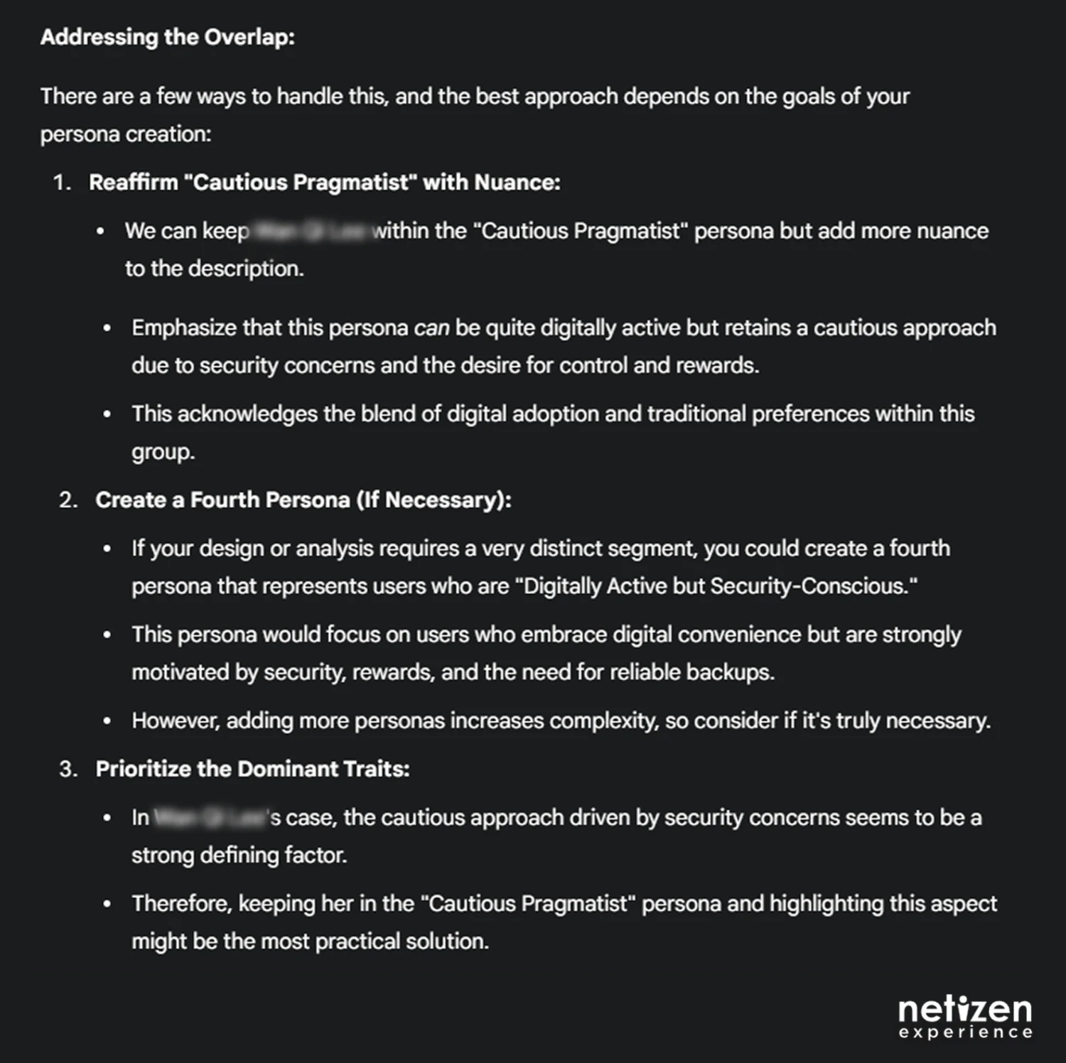 It explained why she appears to fit both Digital Native and Cautious Pragmatist personas, then suggested how to handle the overlap and provided recommendations for the next steps. With the elaborate explanation, I ultimately categorized her as a Cautious Pragmatist, focusing on her underlying attitudes.