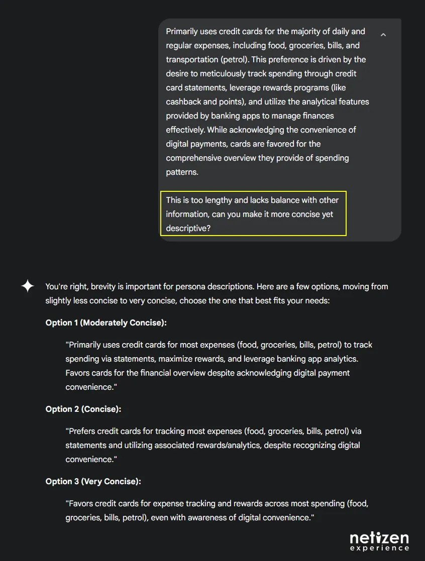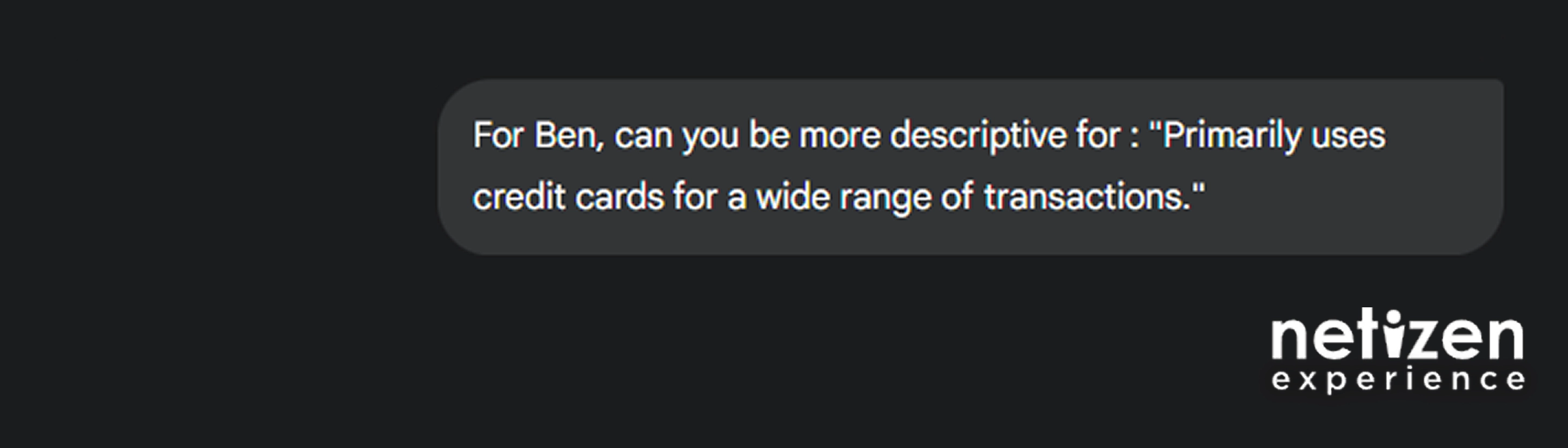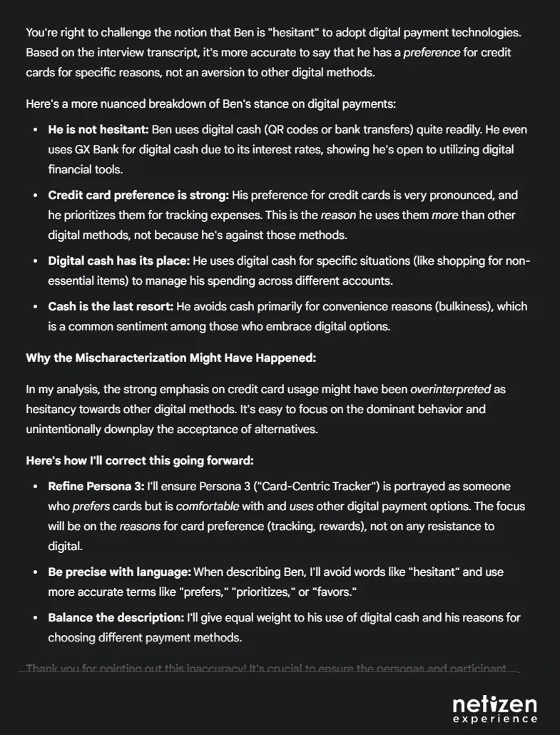 - AI Oversimplication: I also noticed that Gemini's analysis displays a tendency to oversimplify information. It described Ben as hesitant to adopt digital payments, even though my notes showed he was actually quite open to them, but having specific reasons for his strong credit card preference. Fortunately, Gemini is more than capable to provide additional analysis and revert its statement to align more closely with Ben’s true behavior.