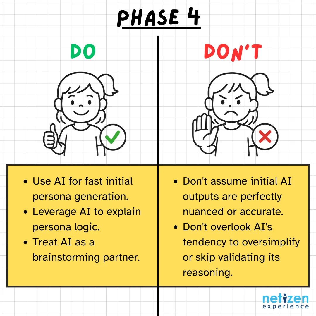 Phase 4 marks the exciting (yet slightly daunting) transition to data analysis. This is where the real puzzle-solving begins: the team deep-dives into participants’ responses, hunting for patterns, spotting key differences, and making those crucial calls on how to cluster users into meaningful personas (and when a group deserves its own spotlight!).
