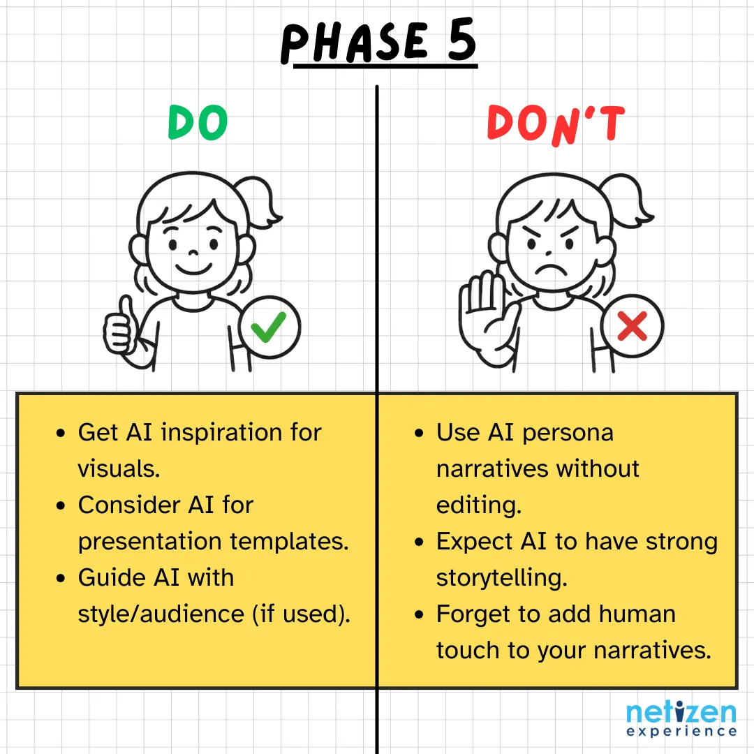 However, I do see AI’s potential to help in generating visual aids and creating relevant presentation templates. For this phase, I would suggest using Gemini or other AI tools for creative inspiration on how to best display information, both in text form and visually. Then, when preparing for stakeholder presentations, provide AI with clear style guidelines, reference materials, and audience personas, and refine with your own human touch, as we have discussed in a previous article.
